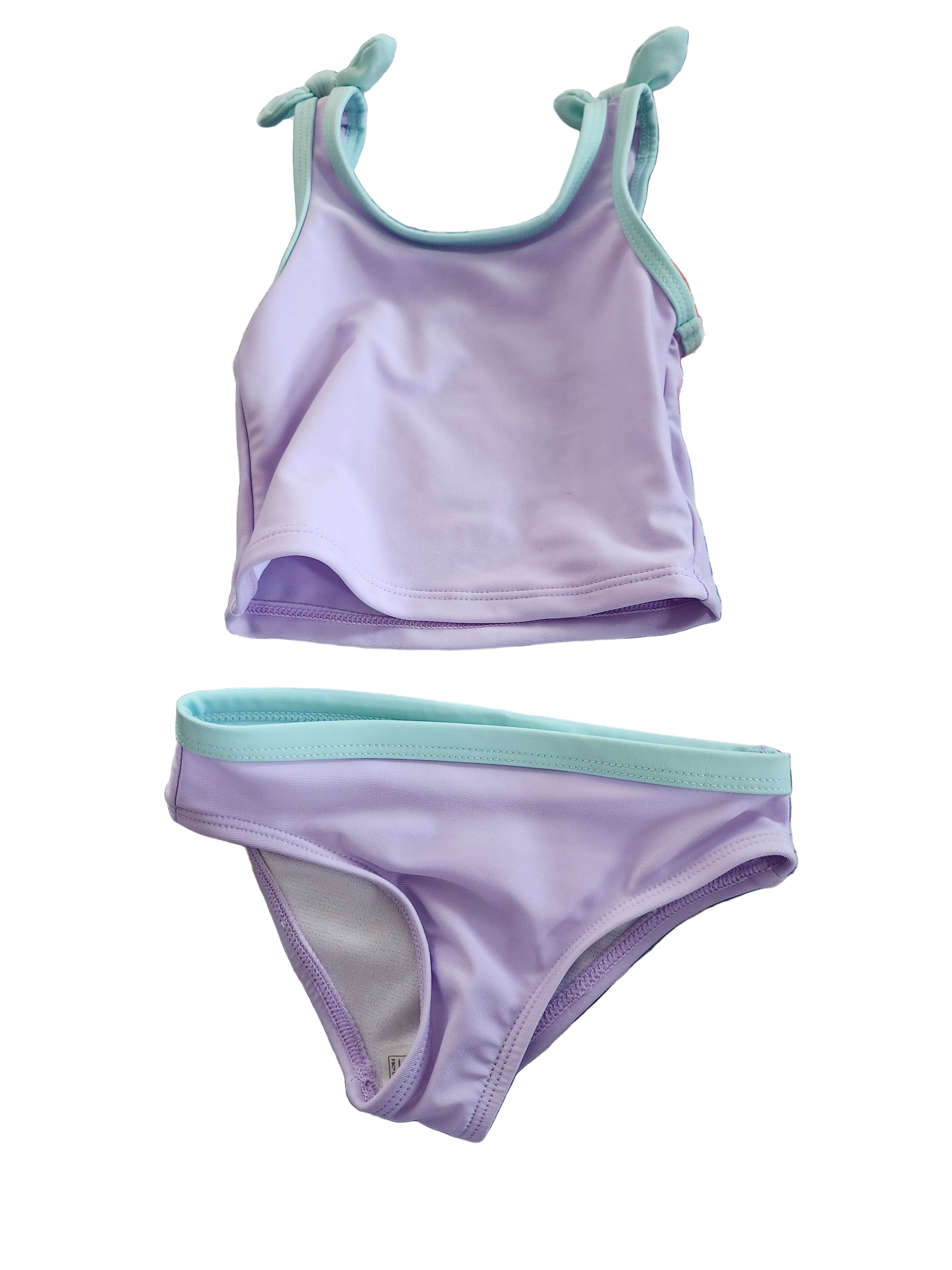 • 💜 Purple Swimsuit Set  – Soft stretch fabric with light blue trim, ideal for beach or pool days