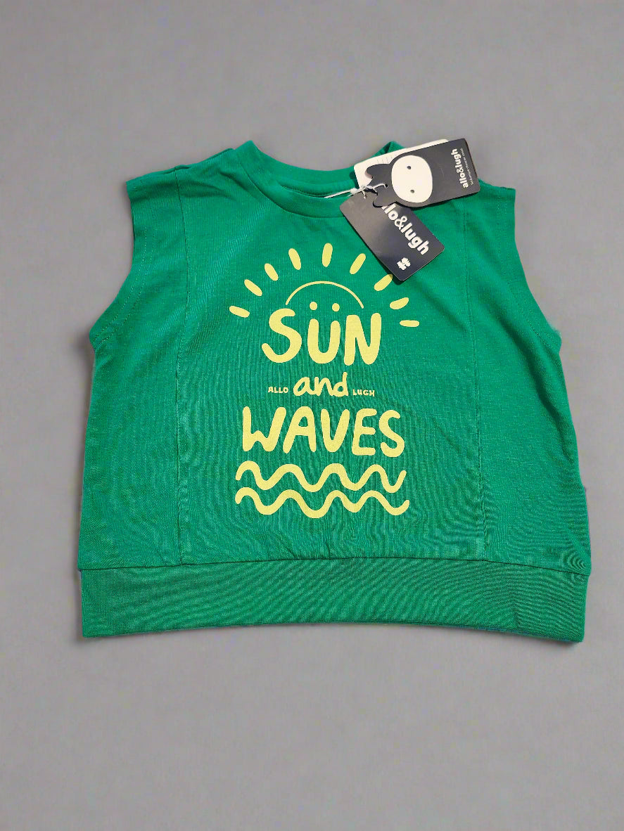 • 🌊 Green sleeveless tee with “SUN WAVES” graphic
