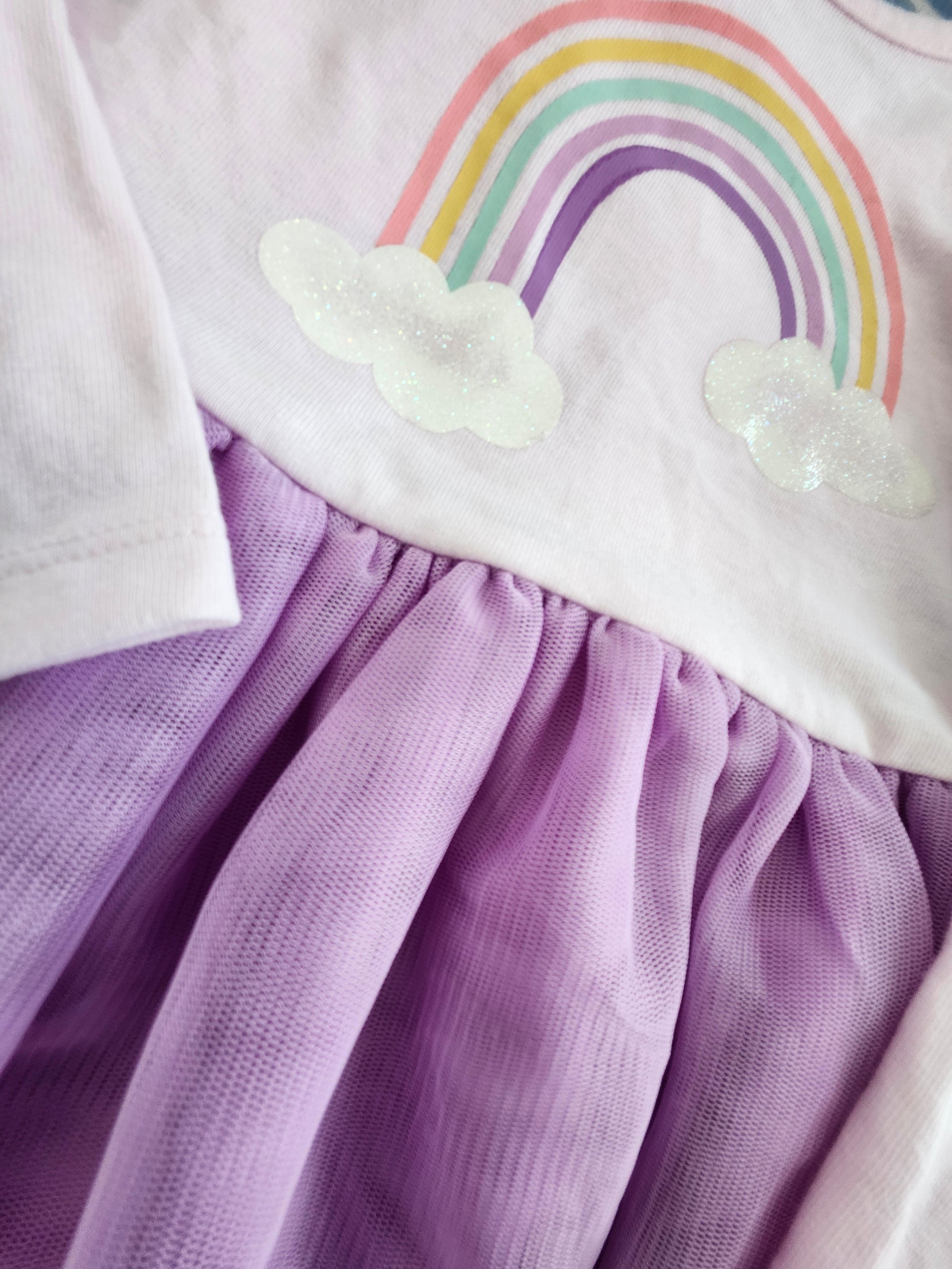 - 💜 A purple rainbow dress with cloud accents—whimsical and twirl-ready